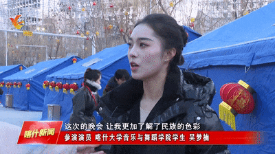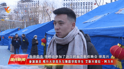 参演演员 喀什大学音乐与舞蹈学院学生艾斯木提拉·阿力木:这次的春晚分会场在喀什,作为喀什大学的学生,我很荣幸,很感动参加了这次的春节联欢晚会,很高兴!