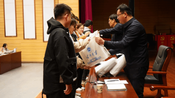 仪式上,邓勇和党委学生工作部相关负责人为受助学生发放冬装。