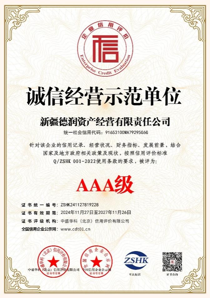 近日,喀什大学校属企业——新疆德润资产经营有限责任公司成功获得“ISO体系”认证,并荣获“AAA级企业信用等级”评定的多项荣誉证书。
