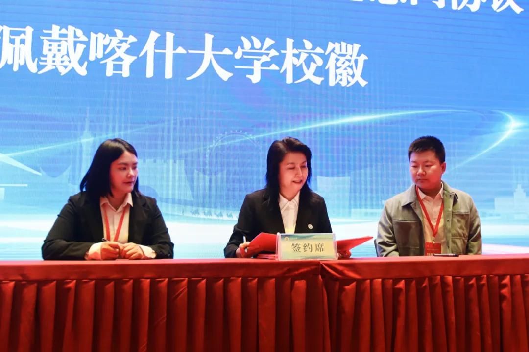 帕力旦·吐尔逊与拟引进博士代表签订人才引进意向协议书,并为拟引进博士代表佩戴喀什大学校徽。