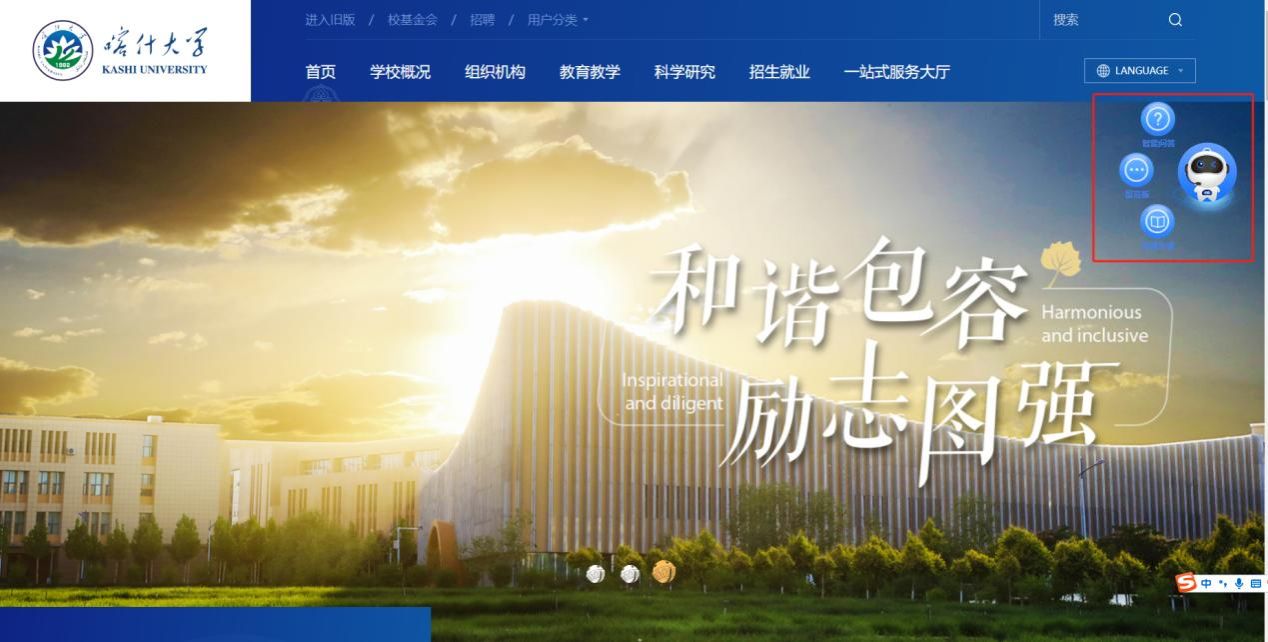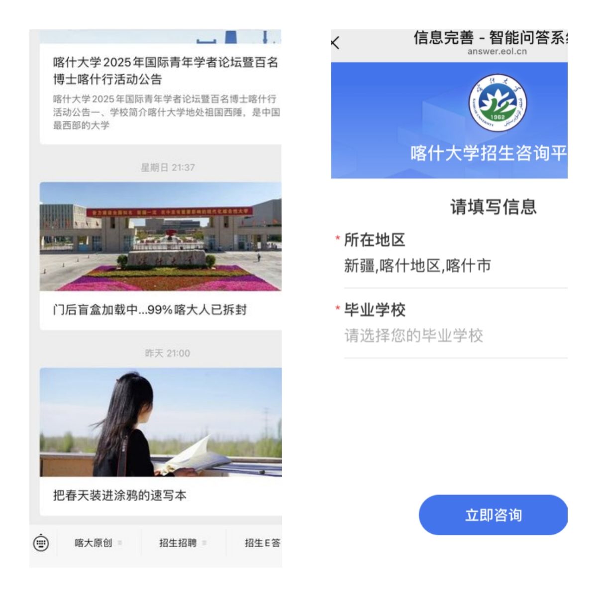 (1)登录喀什大学官网(网址:https://www.ksu.edu.cn/#),点击右侧“智能机器人小E”,在登录界面完善基础信息后即可在线咨询或留言。(操作详情见下图)