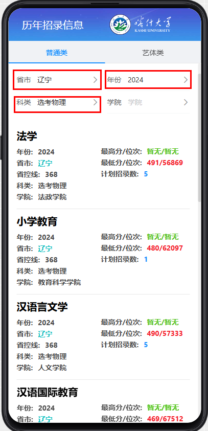 第二步:在招生政策模块点击历年录取信息查询,根据省份、年份、科类等筛选后即可查询相应专业往年的录取分数。