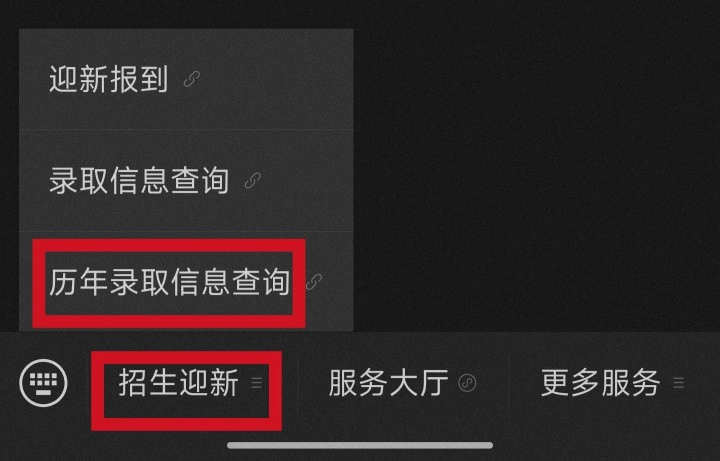 第二步:点击下底部功能栏选择“招生迎新”,再点击“历年录取信息查询”。