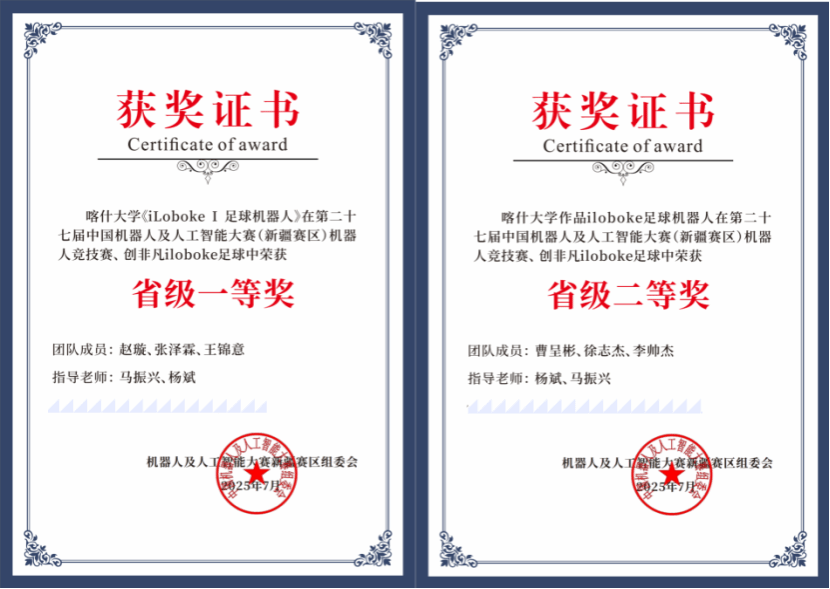 我校学生在备赛过程中积极探索、勇于创新,通过反复实践与优化,在赛场上表现出色,赢得了现场评委的高度认可。最终在第二十七届中国机器人及人工智能大赛(新疆赛区)机器人竞赛、创非凡iloboke足球赛项中荣获一等奖1项、二等奖1项,在睿抗机器人开发者大赛(RAICOM)未成赛区足球竞技赛项中荣获一等奖1项、二等奖1项、三等奖2项。这些成绩的取得,既是我校师生辛勤付出与不懈努力的结晶,也是学校长期以来高度重视实践教学与创新人才培养的有力见证。