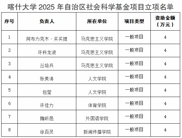 近日,新疆维吾尔自治区科技厅、党委宣传部社科工作办公室公示了2025年度科研项目立项结果,喀什大学2025年共获批35项自治区级科研项目(其中天山创新团队计划项目1项,自然科学基金项目24项,科技特派员农村科技创业行动计划项目2项,社会科学基金项目8项),立项数量创新高。