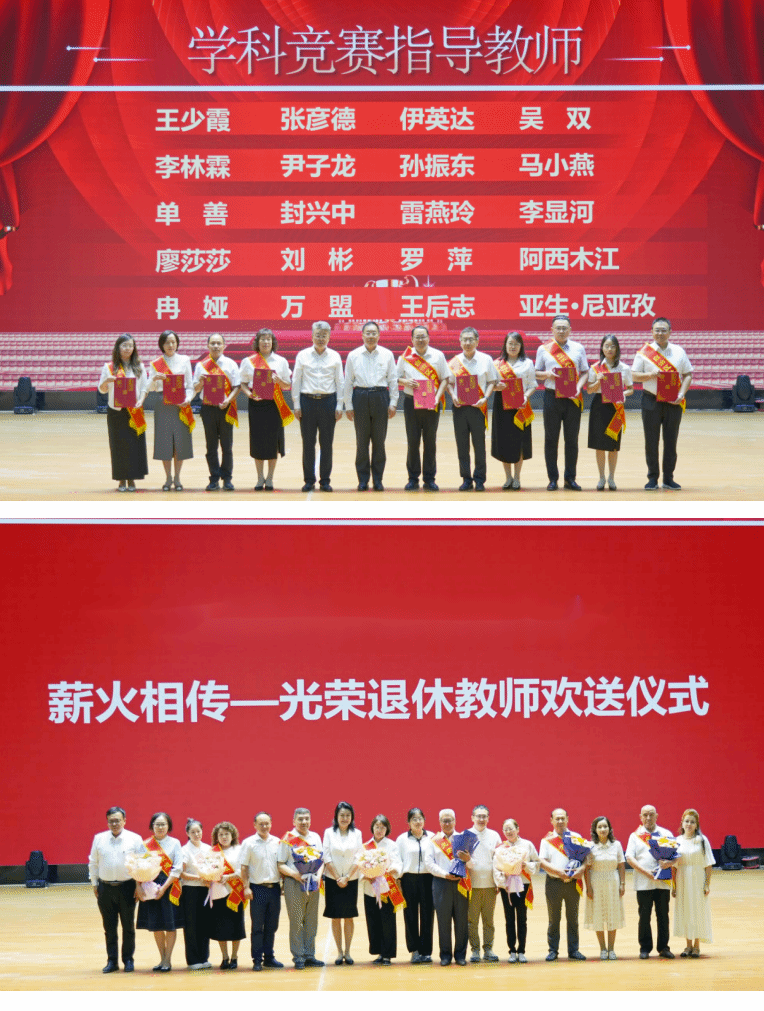 大会对“教育教学工作先进个人”“科研工作先进个人及先进集体”“研究生教育工作先进个人”“学生工作先进个人”“优秀银龄及援疆教师”“师德先进集体及个人”“突出贡献集体”等代表进行表彰,并为光荣退休教师代表献花。