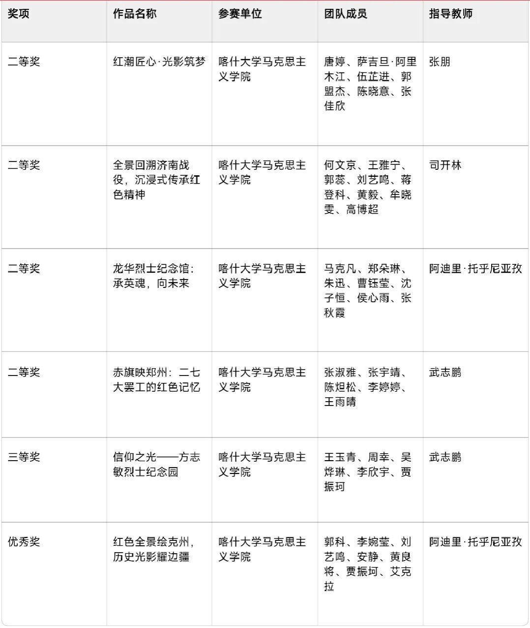 大学生红色全景资源创意展示大赛由教育部全国高校思政课虚拟仿真体验教学中心(天津大学)、教育部课程思政教学研究示范中心(天津大学)、教育部红色文化弘扬基地(天津大学)、天津大学中国共产党人的精神谱系研究中心主办。本届大赛共征集到来自31个省(自治区、直辖市)330余所高校提交的1700余个作品。喀什大学对此次大赛高度重视,从前期策划到作品创作,每一个环节都精心筹备、全力以赴。此次优异成绩的取得,是对喀什大学思政育人成效的有力印证,更是学校创新“大思政课”实践路径的重要成果。喀什大学将充分发挥大赛对教育的“树旗、导航、定标、催化”作用,进一步推动思想政治教育朝着专业化、特色化的方向迈进。