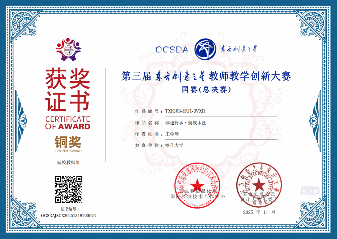 近日,第三届“东方创意之星”教师教学创新大赛总决赛答辩及评审会在江苏大学圆满落幕。我校教师团队凭借扎实的教学创新能力与特色鲜明的教学成果,在众多参赛院校中脱颖而出,斩获多项国家级奖项。杨昊教师团队作品《OBE教育模式下新疆高校设计类一流专业应用型人才培养的探索与实践》获得国赛金奖,张旭冉教师团队作品《从元素解构到设计叙事》获得国赛银奖,王学琦教师作品《非遗传承·侗族木匠》获得国赛铜奖。
