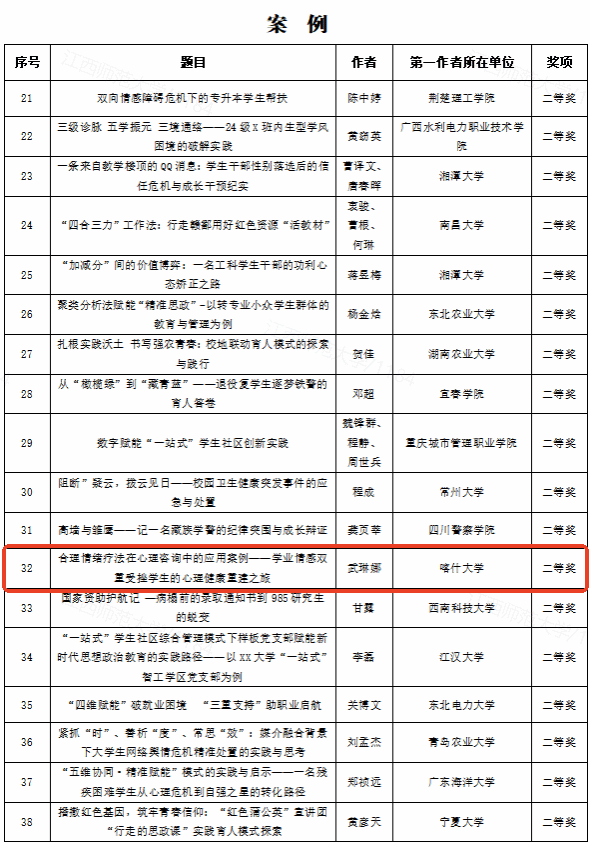 近日,全国高校思想政治工作队伍培训研修中心(江西师范大学)公布2025年度优秀论文、案例及微党课视频评选结果。我校教师申报的《合理情绪疗法在心理咨询中的应用案例——学业情感双重受挫学生的心理健康重建之旅》凭借鲜明实践特色与突出育人价值,在多轮严格遴选后荣获优秀案例二等奖,为学校心理育人工作再添荣誉。