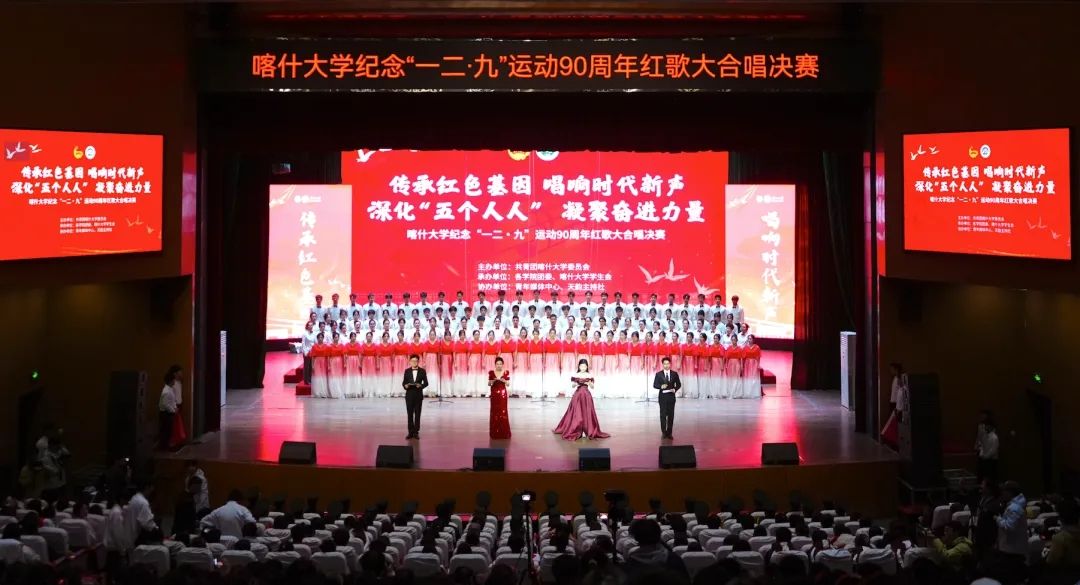 为激励青年学生铭记红色历史、勇担时代责任、厚植爱国情怀,12月7日,喀什大学在新泉校区新时代会堂举办“传承红色基因 唱响时代新声 深化‘五个人人’ 凝聚奋进力量”纪念“一二·九”爱国运动90周年红歌大合唱决赛。喀什大学党委书记丁邦文及其他在家校领导、新疆天山职业技术大学(克州校区)常务副校长周志贤、喀什地区团委及喀什职业技术学院负责同志,喀什大学相关部门、学院领导和师生代表现场参加活动。