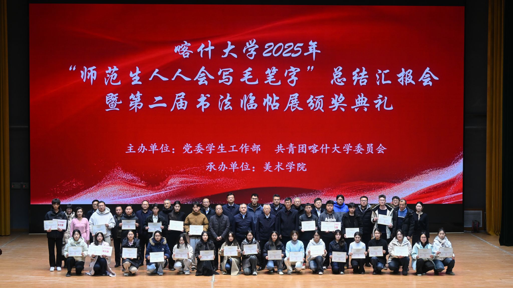 为深入学习贯彻习近平文化思想,进一步推进“五个人人”活动走深走实,12月17日,喀什大学2025年“师范生人人会写毛笔字”总结汇报会暨第二届书法临帖展颁奖典礼在东城校区报告厅举行。校党委书记丁邦文、党委副书记邓勇出席,相关学院、部门负责同志,师生代表参加。党委常委、副校长伊力哈木江·吾买尔主持。